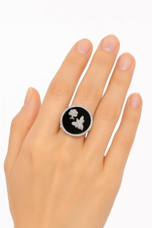 925 sterling silver ring, black enamel ring, butterfly design ring, statement cocktail ring, silver jewellery for women, enamel silver jewellery, cubic zirconia ring, party wear ring, House of SYL jewellery.