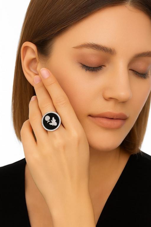 Make a bold yet elegant statement with the 925 Sterling Silver Butterfly & Flower Black Enamel Ring from House of SYL. This designer ring showcases a luxurious black enamel base adorned with a dazzling butterfly and floral motif, beautifully set with premium cubic zirconia stones. Surrounded by a delicate halo of sparkling stones, this enamel silver ring radiates charm and sophistication.