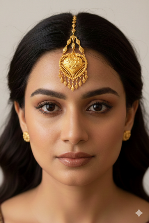 Designed especially for Indian brides, this gold mangteeka complements bridal lehengas, sarees, and traditional attire with effortless grace. The polished gold finish and heritage-inspired detailing make it an ideal choice for weddings, engagements, festivals, and special occasions.